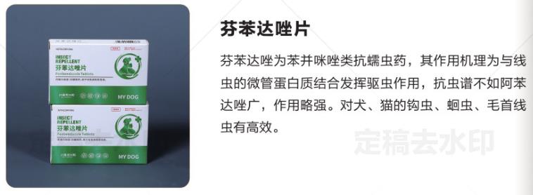 芬苯達唑為苯并咪唑類抗蠕蟲藥,其作用機理為與線蟲的微管蛋白質結合發揮驅蟲作用,抗蟲譜不如阿苯達唑廣,作用略強。對犬、貓的鉤蟲、蛔蟲、毛首線蟲有高效。