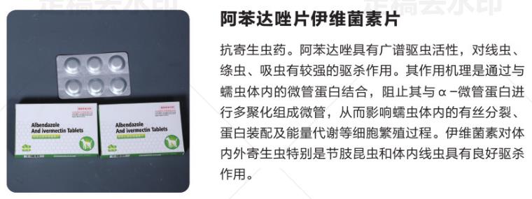 抗寄生蟲藥。阿苯達唑具有廣譜驅(qū)蟲活性,對線蟲、絳蟲、吸蟲有較強的驅(qū)殺作用。其作用機理是通過與蠕蟲體內(nèi)的微管蛋白結(jié)合,阻止其與a-微管蛋白進行多聚化組成微管,從而影響蠕蟲體內(nèi)的有絲分裂、蛋白裝配及能量代謝等細胞繁殖過程。伊維菌素對體內(nèi)外寄生中特別是節(jié)肢昆蟲和體內(nèi)線蟲具有良好驅(qū)殺作用。