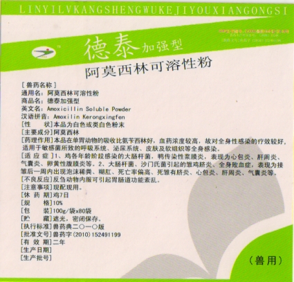 【藥理作用】本品在單胃動物的吸收比氨芐西林好,血藥濃度較高,故對全身性感染的療效較好,適用于敏感菌所致的呼吸系統(tǒng)、泌尿系統(tǒng)、皮膚及軟組織等全身感染。
